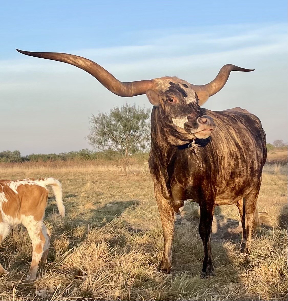 A beautiful brindle cow that has an awesome looking horn set and is definitely a pleasure to see and own. Take a look at her pedigree and take a close look at how all these cows are built in the body as well as all the big twisty horns. You add the caliber of bulls in this pedigree and this is one awesome paper she has backing her. She is well behaved and she threw us a knockout heifer sired by Ruly Rebel in 2025. We're extremely happy to own her and looking forward to all her future calves. She was 81.7 back over a year ago in November of 2024. she should be close to mid 80's now and will get an updated measurement in spring of 2026.
