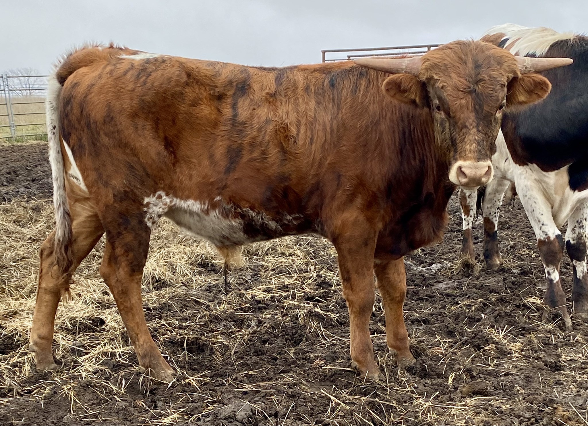 This guy is off to a good start. He has some amazing females in his pedigree and his daddy is a producer. He has a solid build and excellent horn direction.
