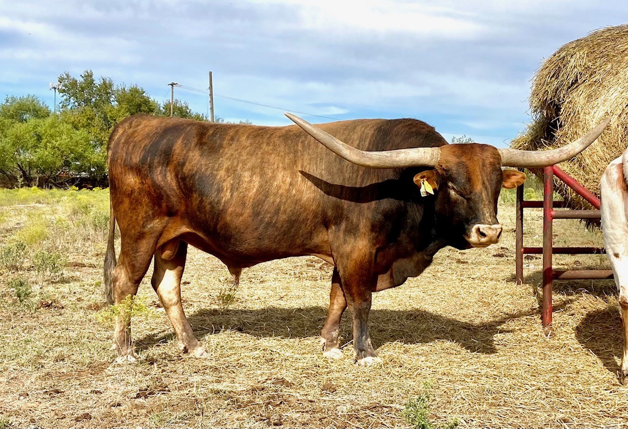 Powerhouse pedigree! Our partnership bull by the great WS Jamakizm out of the 95" Texana Garland Gal. He has made a lasting impact on our herd and is ready to move to new pastures! Very easy to keep and work - no problems and very fertile. Selling 50% ownership with full possession. Great horn shape even with both tips broken.