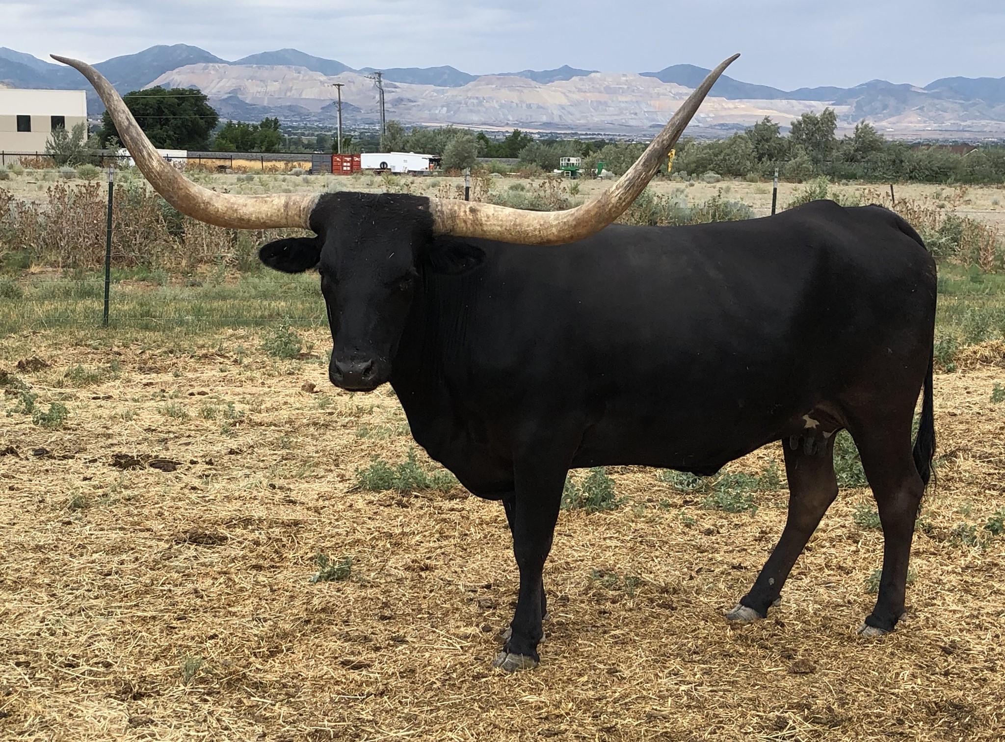 This fantastic girl is our best! She is about three-quarter inches shy of 80 inches ! (and that is after she broke 4 inches off of her left horn a few years ago). The fantastic bull LC Bladen on top and KC Clarabelle on the bottom. She really is something special. Four black and white heifers in a row!